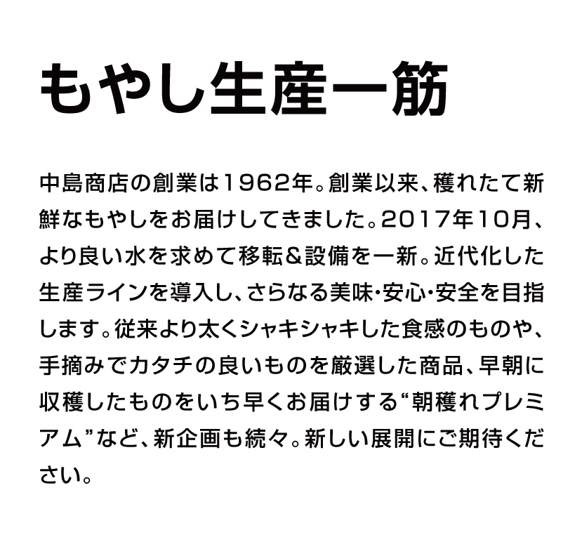 私たちが特にこだわったのはしゃきしゃき感。ミネラルが豊富な地下水を求め工場を移転し、もやしにたっぷりとこの地下水を含ませて、みずみずしく旨味の増した中島もやしが誕生しました。